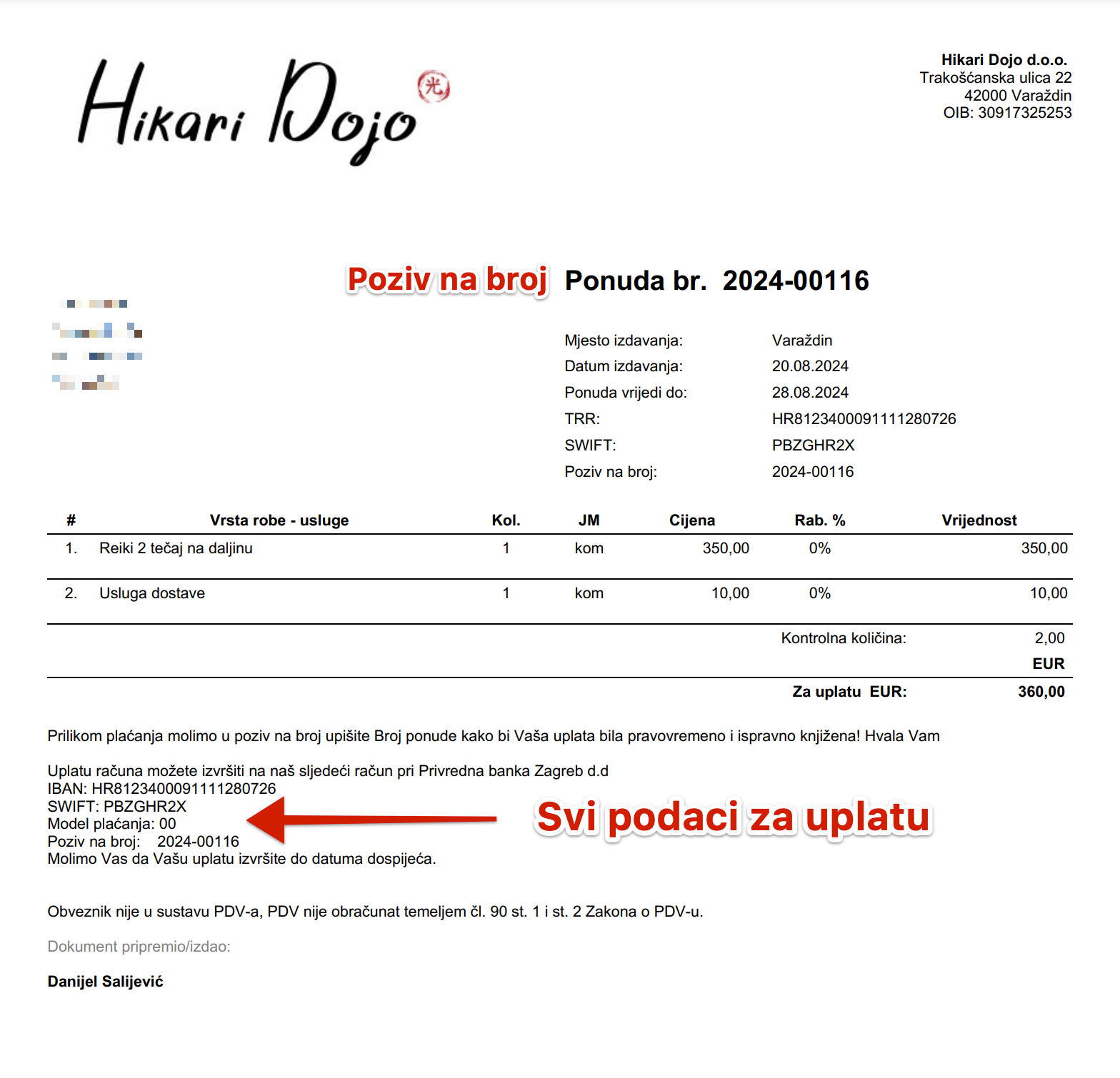 Ljubazno vas molimo da koristite podatke iz ponude ili iz naruđbe ukoliko naručujete putem web shopa kako bismo vašu uplatu mogli povezati sa željenom uslugom.Za uplate po ponudama, molimo koristite sljedeće podatke: